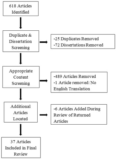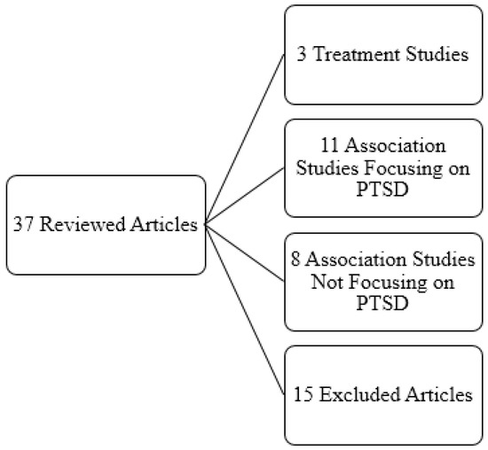 Figure 2 and Figure 3 show search results. Of the 618 articles first returned by the search method, 72 were dissertation and theses and 25 were duplicate articles and were thus excluded, one article was excluded for lack of English translation and 489 articles were excluded because of the lack of appropriate content. Six additional articles were found during review of the returned articles and were found to be relevant and were included. Thus, 37 articles comprised the final review. Two authors reviewed all articles and identified four thematic categories: (1) treatment or longitudinal naturalistic studies of which there were three; (2) non-intervention association studies focusing on PTSD, which included 11 articles; (3) non-intervention association studies not focusing on PTSD, eight articles; and (4) articles not applicable to the review, of which there were 15 which were then excluded from further review. Since only three studies provided information about intervention or longitudinal naturalistic models that assessed the effects of resource gain on PTSD, we have also included in the text and tables non-intervention studies that assess the effects of resource gain on symptoms after trauma to broaden the collective information on the subject.