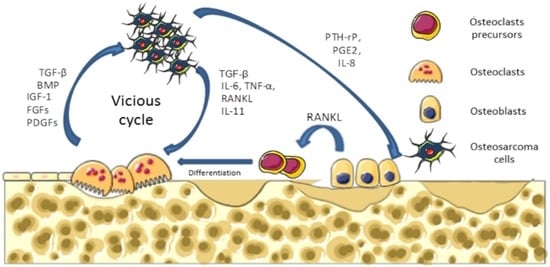 Osteosarcoma are the most common malignant primary bone tumors affecting children and young adults, with 2–3 cases per million per year [1,2,3]. Osteosarcomas arise from mesenchymal bone-forming cells, and mainly occur in long bone extremities, such as the distal femur, the proximal tibia, or the humerus [4]. Molecular mechanisms underlying osteosarcoma formation are characterized by complex karyotype and multiple genomic alterations [5,6]. Osteosarcomas are pathologies that affect bone remodeling, involving alterations in both osteoblast and osteoclast functions. They are characterized by the direct formation of osteoid matrix by tumor cells, associated with severe osteolytic lesions. To explain these dysregulations of bone cell functions, a vicious cycle between tumor and bone cells has been described during osteosarcoma development (Figure 1). In brief, cancer cells produce soluble factors, such as cytokines (IL-6, IL-11, TNF-α, RANKL, etc.) that activate osteoclastogenesis, leading to bone degradation. Following bone resorption, growth factors trapped in the bone matrix, such as IGF-1 or transforming growth factor-β (TGF-β), are released in the bone microenvironment and stimulate tumor growth [7].