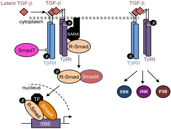 - Moustakas, A.; Heldin, C.H. The regulation of TGFbeta signal transduction. Development 2009, 136, 3699–3714. [Google Scholar] [CrossRef] [PubMed]