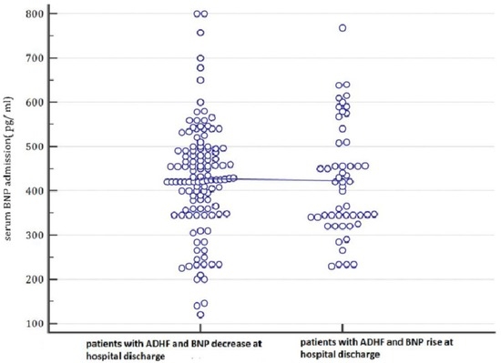 In this study, we aimed to detect the six-month all-cause mortality of a number of ADHF patients, all characterized by the fact of having experienced at least one hospitalization for ADHF in the period from January 2012 to January 2015. Subsequently, this cohort was subdivided for study purposes into two subgroups, of which the former consisted of patients who had exhibited a reduction in their serum BNP at the end of hospital stay compared with the admission values, while the latter was composed of patients with increasing BNP at discharge.