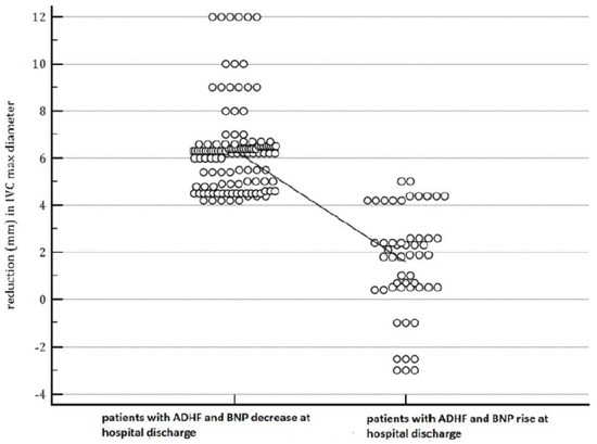 The figure shows that patients with a BNP increase at the time of discharge had a lower reduction in IVC diameter from admission to discharge (1.58 ± 2.2 mm vs. 6.32 ± 1.82 mm, p = 0.001). In the dot-plot, a continuous line connects the means of the two groups (patients with decreasing BNP and the patients whose BNP shows an increase at discharge).