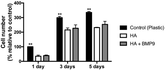 3.2. Effect of HA Alone and in Combination with rhBMP9 on ST2 Cell Proliferation