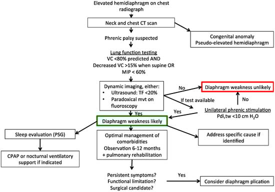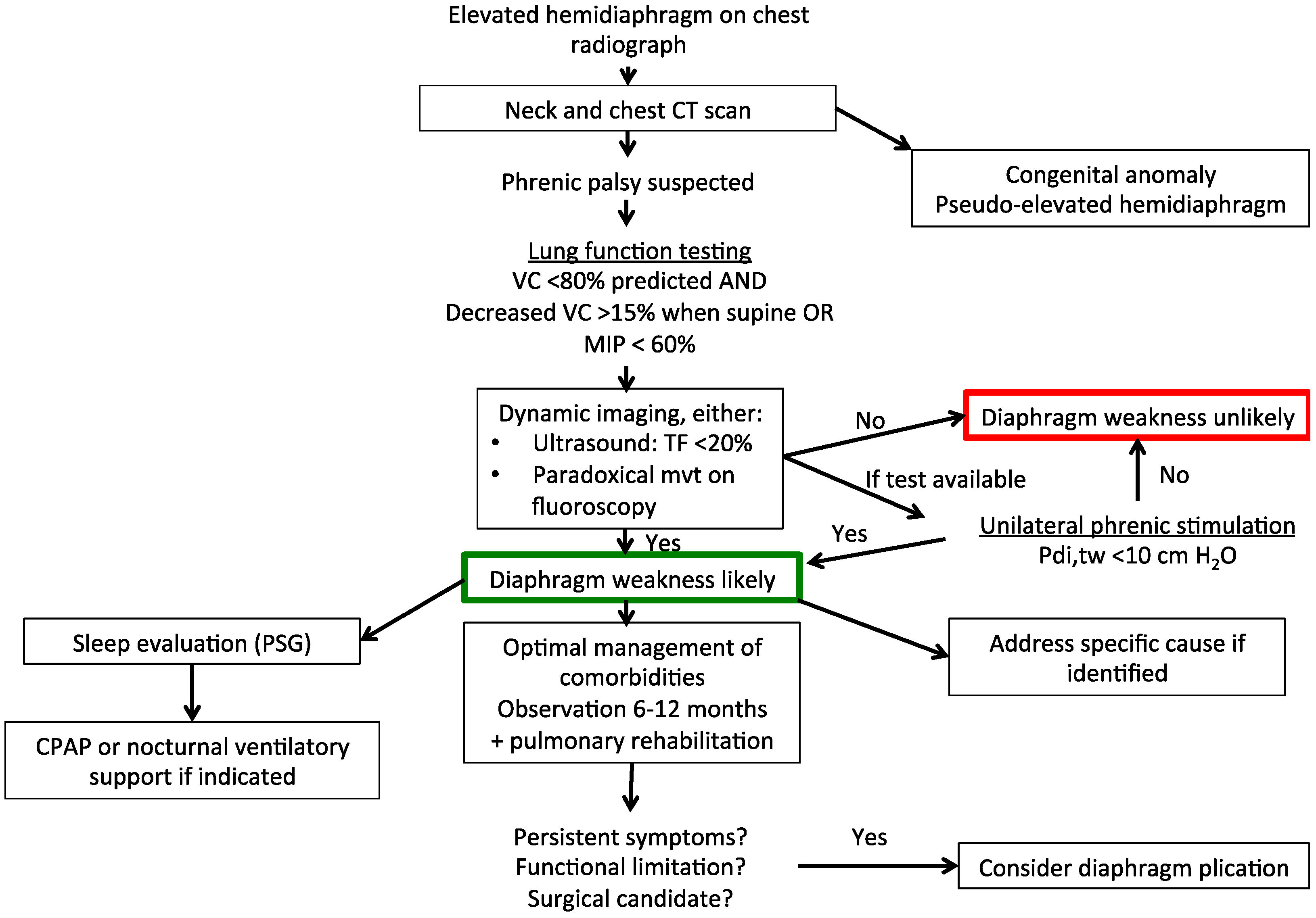 Suggested diagnostic and therapeutic algorithm for unilateral diaphragm weakness. CT, computed tomography; VC, vital capacity; MIP, maximal inspiratory pressure; TF, thickening fraction of the diaphragm; PSG, polysomnography; CPAP, continuous positive airway pressure; Pdi,tw, twitch transdiaphragmatic pressure.