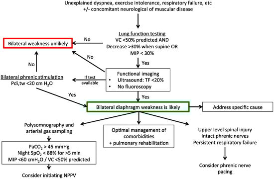 Suggested diagnostic and therapeutic algorithm for bilateral diaphragm weakness (outside of the intensive care setting). VC, vital capacity; MIP, maximal inspiratory pressure; TF, thickening fraction of the diaphragm; NPPV, non-invasive positive pressure ventilation; PaCO2, arterial partial pressure of carbon dioxide; SpO2, peripheral oxygen saturation; Pdi,tw, twitch transdiaphragmatic pressure.