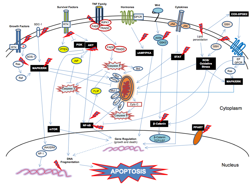 Cancer is often described as a disorder of the balance between cell growth and death []. On the one hand, defects in signaling pathways promoting cell growth and survival occur in cancer cells and high constitutive levels of MEK/ERK, PI3K/Akt, JAK/STAT or IKK/IκB/NF-κB pathways are frequently observed in human cancers [,]. On the other hand, as already mentioned in Section 2, defects along the apoptotic pathways also occur in cancer cells, leading to resistance to apoptosis [,]. Therefore, all the molecules, signals and networks involved in cancer cell survival and death are potential targets for apoptosis-based cancer therapies.