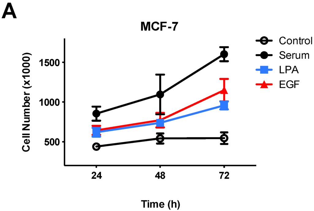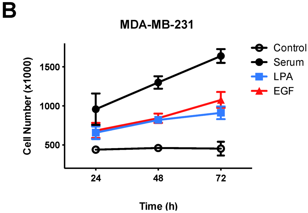 Effects of growth factors on proliferation of human breast cancer cells. Proliferation assays were conducted using serum-starved MCF-7 (A) or MDA-MB-231 (B) cells. Cells were incubated with or without 10% FBS (serum), 10 µM LPA, or 10 nM EGF for the indicated times (growth factors were added at time “0”). Each data point represents the mean ± SEM (n = 4) of values (number of live cells per well) from two separate experiments, each done in with two separate replicate wells of cells for each condition. Data analysis was performed using two-way ANOVA, followed by Tukey’s multiple comparisons test. All growth factor values were significantly (p < 0.05) different from the control value at all time points shown, except for LPA at 24 h in MCF-7. Serum values were significantly different from lysophosphatidic acid (LPA) or epidermal growth factor (EGF) at all time points tested.