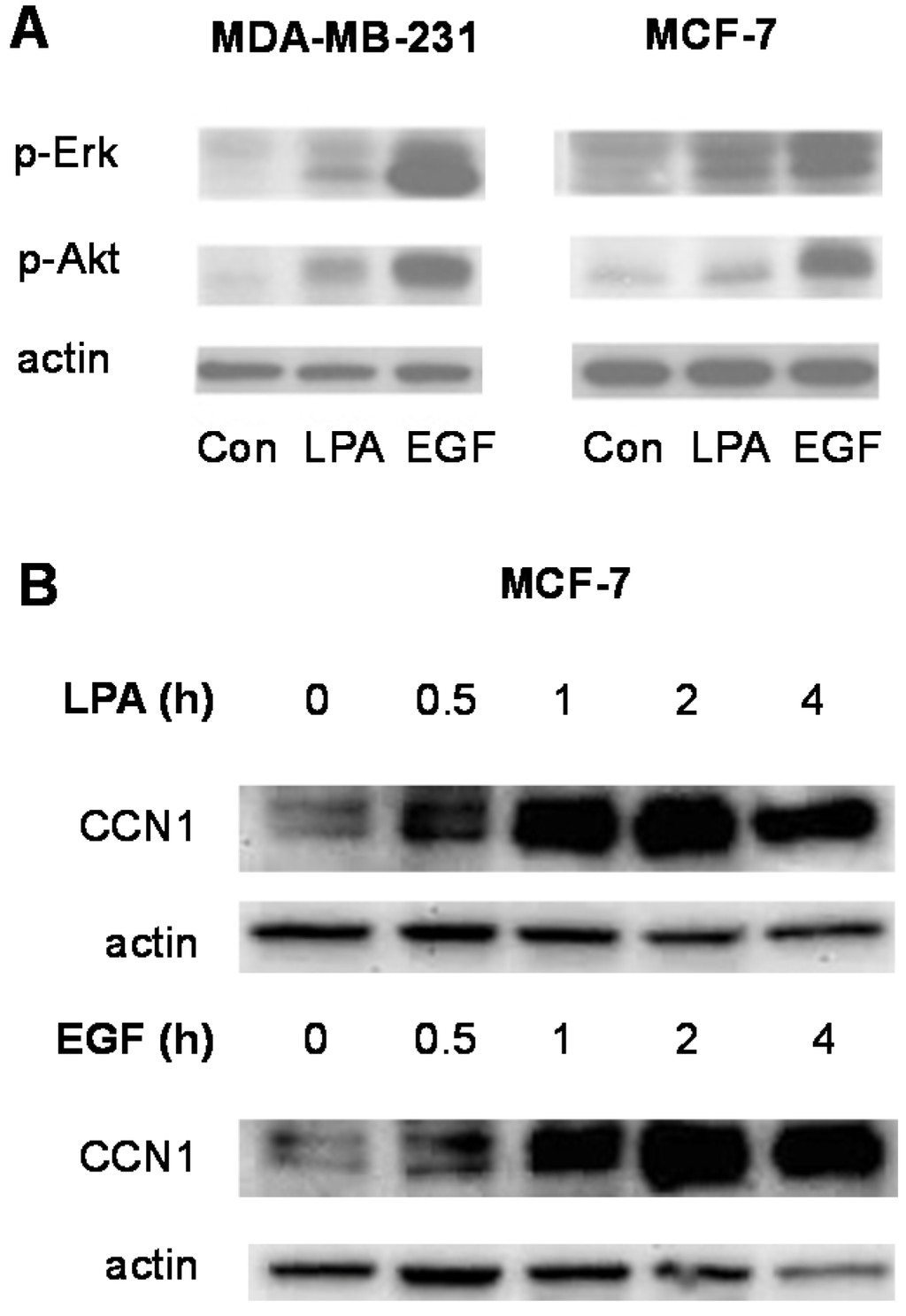 Effects of LPA and EGF on signal transduction events in human breast cancer cells. (A) Serum-starved MCF-7 and MDA-MB-231 cells were incubated with 10 µM LPA or 10 nM EGF for 5 min. Whole-cell extracts were immunoblotted using antibodies recognizing phosphorylated active Erk and Akt. An immunoblot for total actin was performed as a loading control; (B) Serum-starved MCF-7 cells were incubated for the indicated times with 10 µM LPA or 10 nM EGF. Whole-cell extracts were immunoblotted using antibody recognizing total CCN1. An immunoblot for total actin was performed as a loading control. Each experiment is representative of at least three separate experiments.