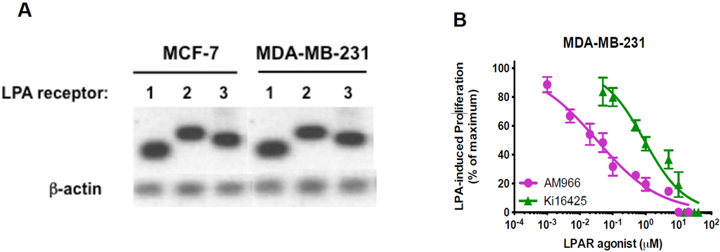 Previous studies have shown that LPA receptors are expressed in breast cancer cell lines. One group performed a comprehensive analysis of LPA receptor expression in commonly-used breast cancer cell lines [33]. Their data show that MDA-MB-231 and MCF-7 cells, among other cell lines, express LPA1, LPA2, and LPA3. LPA1 has been determined to mediate many of the actions of LPA in breast cancer cells [34,35,36,37]. RT-PCR experiments conducted in our lab confirmed that LPA1 was expressed in both MCF-7 and MDA-MB-231 cells under the conditions used herein (Figure 3A).