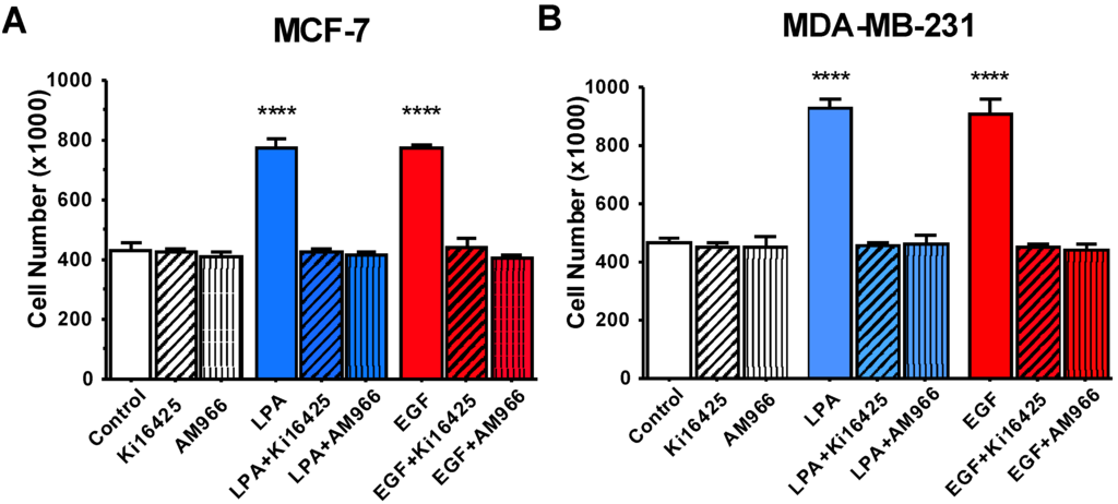 3.1. Effects of Lysophosphatidic Acid (LPA) and Epidermal Growth Factor (EGF) on Breast Cancer Cell Proliferation