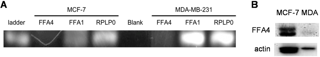 We next turned to the effects of n-3 FAs. We examined whether FFARs are expressed in MCF-7 and MDA-MB-231 cells. Both receptors have previously been reported to be present in MCF-7 cells, based on flow cytometry [25]. Using RT-PCR, we assessed mRNA levels for FFA4 and FFA1, the two receptors for long chain free fatty acid (Figure 5A). Both PCR products were detected, although the PCR product for FFA4 was present at such low levels that it was difficult to visualize. To confirm that FFA4 was expressed, we performed immunoblotting using an antibody previously validated in our laboratory [1], and did detect FFA4 protein (Figure 5B). We were unable to validate an appropriate antibody for FFA1, but our PCR results suggest that FFA1 is likely expressed at higher levels than FFA4 in the two breast cancer cell lines. These results indicate that the roles of both FFA1 and FFA4 need to be considered in breast cancer cells.