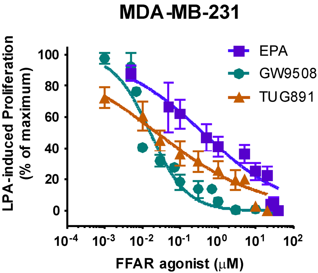 Dose-response for effects of FFAR agonists on breast cancer cell proliferation. Serum-starved MDA-MB-231 cells were incubated for 48 h with and without 10 µM LPA in the absence and presence of the indicated concentrations of EPA, GW9508, and TUG-891. The number of cells achieved in response to LPA alone was defined as 100% response; the number of cells present in the absence of LPA was defined as 0% response. Each point represents mean ± SEM (n ≥ 4 for values obtained from at least two experiments, each performed with two separate replicate wells of cells for each experimental condition.