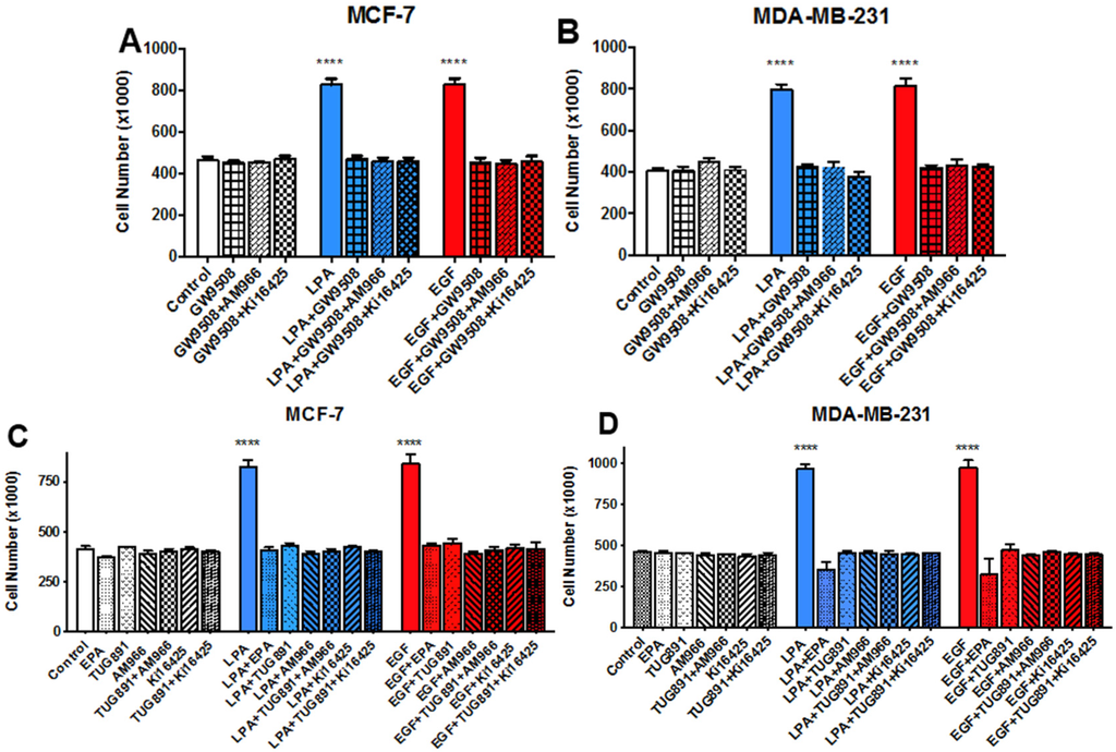 We next tested the effects of LPA1 inhibitors on both LPA- and EGF-induced breast cancer cell proliferation (Figure 7). Neither the LPA antagonists AM966 and Ki16425, nor the FFAR agonists EPA, GW9508, and TUG891, had any significant effects on cell numbers on their own. However, all agents completely inhibited LPA- and EGF-induced proliferation in MCF-7 and MDA-MB-231 cells, when added individually, consistent with the results in Figure 4 and Figure 6. Although EPA appeared to decrease cell numbers slightly below control values in the presence of LPA or EGF, the effect was not significant. There was no additional effect (e.g., cytotoxicity) on cell numbers when LPA antagonists were combined with FFAR agonists GW9508 or TUG891 (Figure 7). Thus, both LPA antagonists and FFAR agonists can block the effects of LPA and EGF on breast cancer cell proliferation.