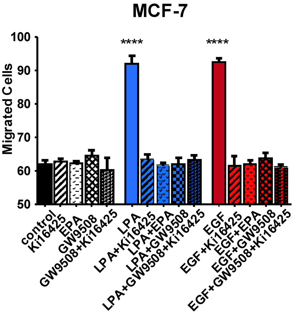 Effects of LPAR agonists on MCF-7 cell migration. Serum-starved MCF-7 cells were treated with 10 µM Ki16425, 20 µM EPA, 1 µM GW9508, 10 µM LPA, or 10 nM EGF, either alone or in combination. After a 6-h migration period, cells were analyzed as described in Methods. Each bar represents the mean ± SEM (n = 4) of values (total number of migrated cells/well) obtained from two separate experiments, each of which used two separate replicate wells of cells for each experimental condition (**** p < 0.0001 vs. control). Data were analyzed using one-way ANOVA, followed by Tukey’s multiple comparisons test.