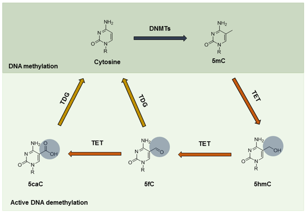 Chemical structures of TET-oxidized products. The DNA base cytosine can be methylated as epigenetic regulation at the DNA level by DNMTs. DNA methylation affects transcription and governs genomic stability during development as well as cancer progression. The methylated product (5-methylcytosine, 5mC) can be reversed actively by a set of enzymes, TET proteins and TDG back to cytosine. The intermediate products include: 5-hydroxymethylcytosine (5hmC), 5-formylcytosine (5fC), and 5-carboxylcytosine (5caC). The amount of 5hmC serves as a marker to indicate the status of DNA demethylation. Loss of 5hmC is often seen in cancers, particularly in myeloid and leukemia. TET: the Ten-eleven translocation family protein; DNMT: DNA methyltransferase; TDG: thymine-DNA glycosylase.