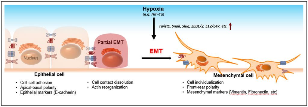 The epithelial-mesenchymal transition (EMT). The process of EMT requires loss of cell-cell contact, apical-basal polarity, and adhesion molecules (e.g., E-cadherin). Transformed epithelial cells then gain front-rear polarity and dissociate from the neighboring cells with increased expressions of mesenchymal markers. Thus, EMT increases cell motility which facilitates invasion and metastasis during cancer progression. Hypoxia is one of the driving forces that facilitate EMT. During hypoxia, many transcriptional regulators that govern the expressions of E-cadherin are activated by HIF-1α. As a result, downregulation of E-cadherin facilitates the development of mesenchymal phenotypes, leading to invasion and metastasis.
