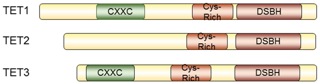 The TET protein family and their structures. Schematic structures of TET1, TET2, and TET3. TET proteins contain a Cys-rich region and a double-stranded helix (DSBH) at the C-terminus. TET proteins require cofactors, such as Fe(II) and 2OG, to hydroxylate substrates. Both TET1 and TET3 proteins contain a CXXC zinc-finger domain at the N-terminus, which can distinguish the methylation status of DNA.