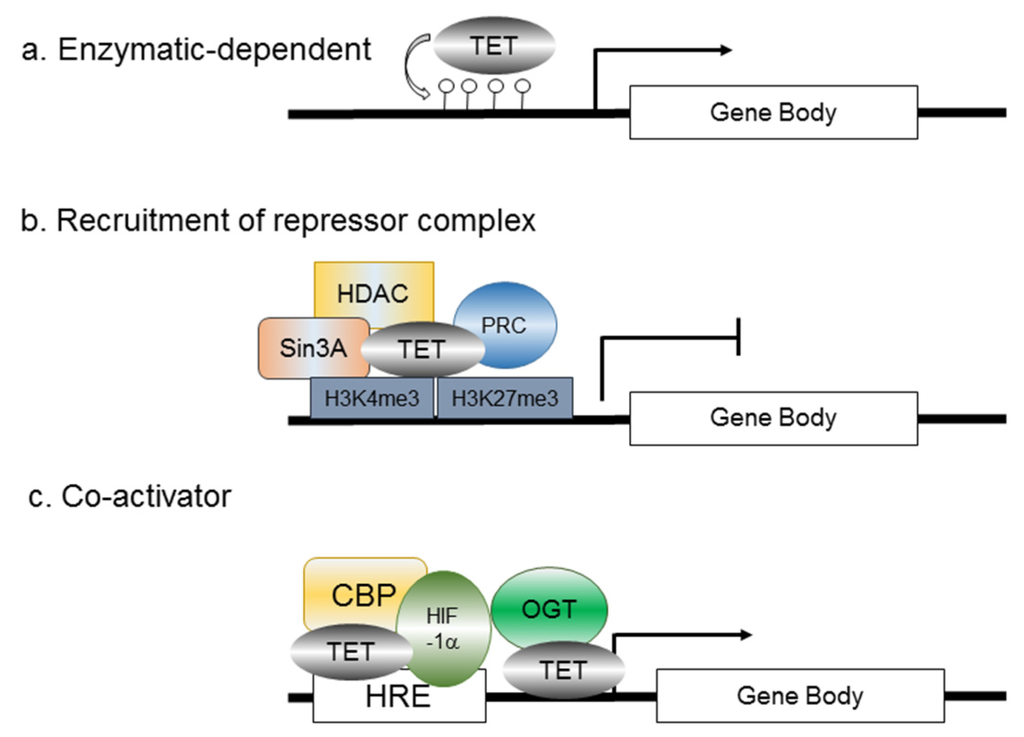 Interestingly, although TET activities and 5hmC loss are frequently observed in cell lines or tumor specimens, tumors exposed to hypoxia are associated with an upregulation of global 5hmC by TET induction [84]. The Godley group shows that hypoxia can induce TET1 expression, thereby enriching global 5hmC, and 5hmC is specifically gained at hypoxia-regulated genes in neuroblastoma [84] (Figure 5a). The versatile role of TET proteins in transcription regulation independent of their enzymatic activity has been reported in other studies. TET1 can bind to H3K4me3- and H3K27me3-enriched promoters and recruit the EZh2 Polycomb complex indirectly [54], or it can associate with the Sin3a histone deacetylase repressive complex [55] (Figure 5b). Moreover, proteomic studies have revealed binding between TET2, TET3 and the O-linked N-acetylglucosamine transferase (OGT) glycosyltransferase [85]. TET2/3 promotes GlcNAcylation and enhances H3K4me3 via SET1/COMPASS methyltransferase complex [86]. These findings may link metabolism to epigenetic modification, and to the transcriptional control of gene expression. In agreement with the above discoveries where TET mediates transcriptional regulation independent of the dioxygenase activity, Tsai et al. further explore the role of TET1 under hypoxia [87]. By RNA sequencing and 5hmC sequencing comparing TET1 knockdown cells under normoxia with those under hypoxia, one of the regulators in the cholesterol metabolic process, insulin induced gene 1 (INSIG1), was identified. Among other affected genes are mostly members in metabolic pathways, including sterol and farnesyl diphosphate metabolism, suggesting a tight connection between epigenetic modification and metabolic processing. Knockdown of TET1 or INSIG1 mitigates the expression of a set of hypoxia-induced genes involved in glucose metabolism and EMT. Interestingly, TET1 not only increases 5hmC peaks in the INSIG1 promoter, but also serves as a transcription co-activator independent of its enzymatic activity to modulate the transactivation activity of HIF-1α [87]. TET1 may form a complex with HIF-1α/CBP, or with OGT, to facilitate hypoxia-mediated gene expressions [87] (Figure 5c). This line of evidence first connects hypoxia-regulated TET1/5hmC to metabolism and EMT. TET2 also recruits Hdac2 to repress IL-6 gene expression independent of its DNA demethylating activity [88]. In line with this investigation, Wu et al. have also demonstrated that in breast cancer, hypoxia/HIF causes genome-wide changes in DNA demethylation by upregulating TET1 and TET3, which, in turn, mediate the activation of TNFα-p38-MAPK [89]. This pathway is essential for breast tumor initiating cell (BTIC) capabilities as well as EMT promotion in breast cancer, suggesting a linkage between hypoxia-induced EMT and TET proteins. Other example shows that TET1 knockdown suppresses their proliferation and blocks cell-cycle progression at the G1 phase in human 786-O renal cells [90]. Further investigation is required to determine the impact of hypoxia-regulated TET1 and its possible role in EMT/metabolism in cancer.