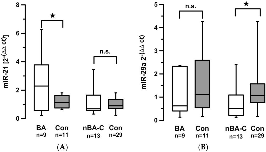 Circulating levels of miR-21 (A) and miR-29a (B) are compared between children with biliary atresia (BA), children with cholestatic disease other than biliary atresia (non-BA), and healthy controls (Con). ★ indicates p < 0.05. n.s.: not statistically significant.