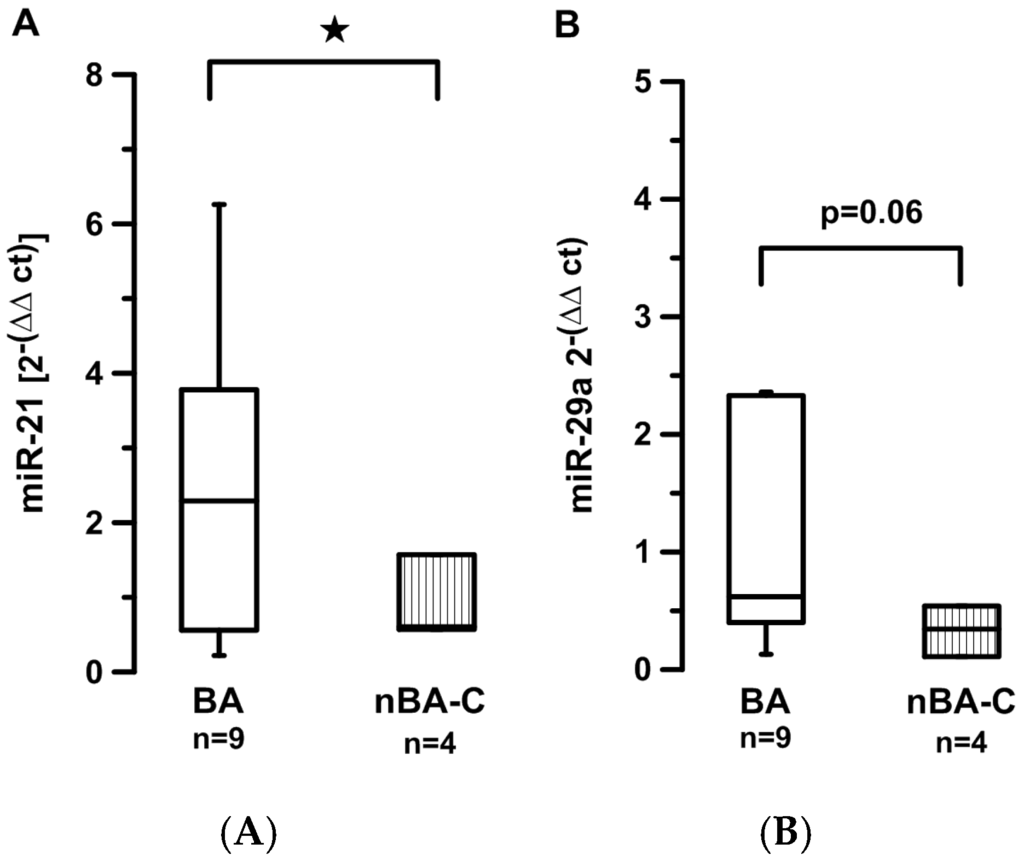 Circulating levels of miR-21 (A) and miR-29a (B) are compared between children with biliary atresia (BA) and age-matched children with cholestatic disease other than biliary atresia (nBA-C). ★ indicates p < 0.05.