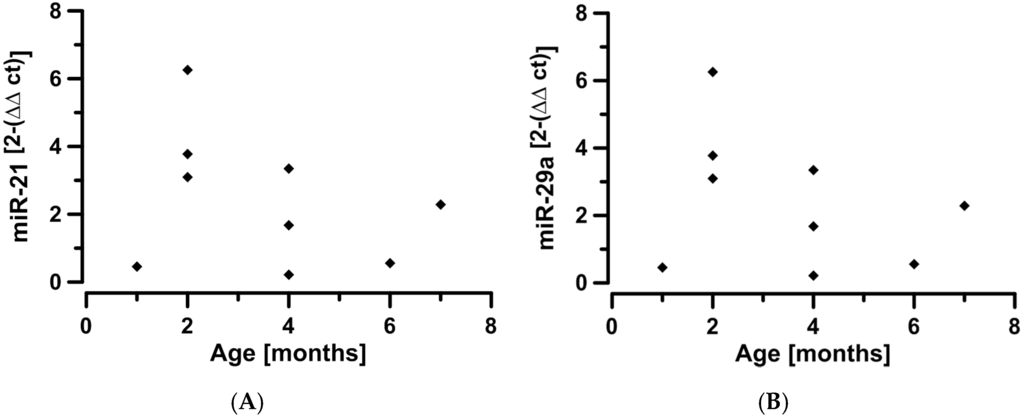 Circulating miR-21 (A) and miR-29a (B) are plotted against age in biliary atresia children. While these represent cross-sectional, not longitudinal data, there still appears to be a change in miRNA expression over time that potentially correlates with stage of disease.