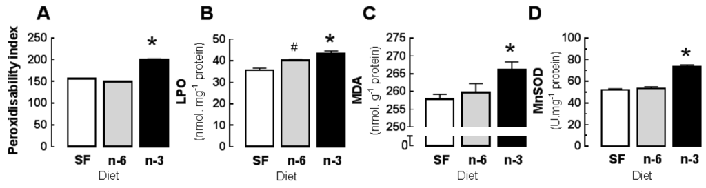 The activity of MnSOD in basal and non-I tissue was significantly greater in LCn-3 PUFA hearts, than in SF or n-6 PUFA hearts (Figure 3C). In basal and non-I tissue there were no significant dietary differences in CuZnSOD activity (basal, non-I (U·mg−1 protein): SF 15.3 ± 0.9; n-6 PUFA 16.9 ± 0.7; LCn-3 PUFA 17.4 ± 0.6 n = 18) (p > 0.05) or GPX (basal, non-I (mU·mg−1 protein): SF 19.2 ± 1.5; n-6 PUFA 19.7 ± 1.5; LCn-3 PUFA 21 ± 1.2 n = 15). The concentration of α-tocopherol was significantly greater in n-6 PUFA hearts than in either LCn-3 PUFA or SF hearts (p < 0.05) (basal, non-I (μM): SF 6.1 ± 0.4; n-6 PUFA 6.9 ± 0.2; LCn-3 PUFA 5.9 ± 0.6 n = 15).
