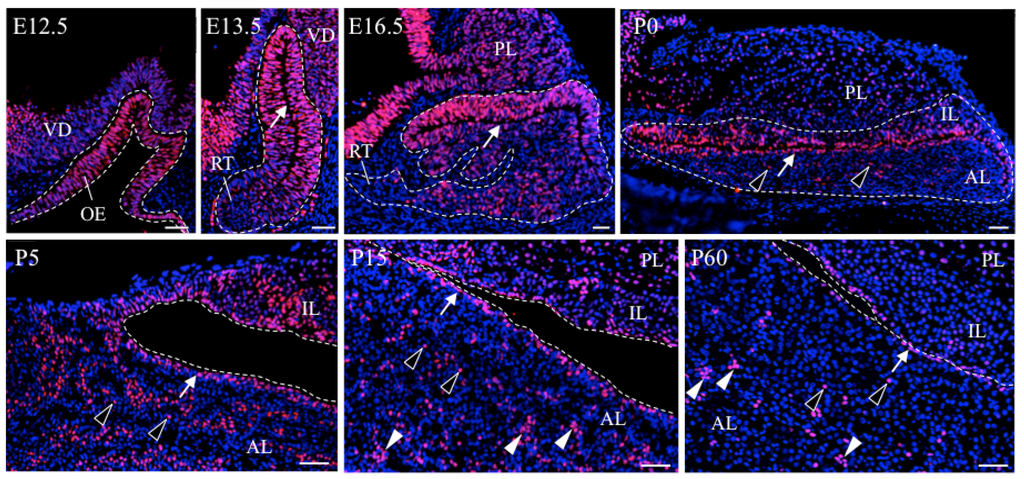 These observations led us to hypothesize that CAR+/SOX2+-stem/progenitor cells migrate from the MCL toward the parenchyma by undergoing EMT at the initiation of the postnatal growth wave, and settle down as a part of forming the parenchymal niches via MET. In this process of MET, CAR+-stem/progenitor cells might re-upregulate both Sox2 and E-cadherin expression after reaching their destined place, similar to what was verified in neural crest cells (described in Section 3.1) [14].