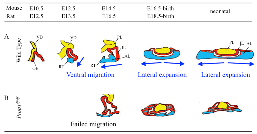 A model of migration of stem/progenitor cells during pituitary development in wild-type and Prop1df/df mice [27]. (A) In wild-type mice, proliferating stem/progenitor cells in the area surrounding MCL migrate toward the anterior lobe (the ventral region of Rathke’s pouch) to form E12.5 to E14.5. Migrated progenitor cells are induced to exit from the cell cycle and differentiate according to the spatiotemporal order of multiple growth factors [1,56]. (B) Prop1-mutant mice (Prop1df/df) show no difference in pituitary morphology until E12.5. However, migration of stem/progenitor cells from the MCL to ventral regions failed, resulting in dysmorphology of Rathke’s pouch, in particular the lack of an anterior lobe by E14.5 [2,27,58,59]. During the neonatal period, Prop1df/df mice also show hypoplasia because of enhanced apoptosis in the anterior lobe. AL: anterior lobe, IL: intermediate lobe, OE: oral ectoderm, PL: posterior lobe, RT: rostral tip, VD: ventral diencephalon. Panels A and B are reproduced and modified from reference [27], with permission. © 2006, The Endocrine Society, Whashington, DC., USA.