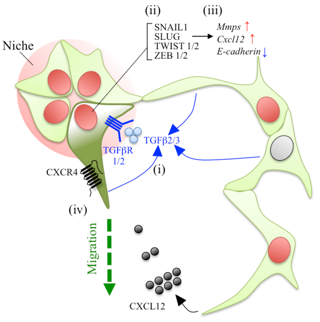 A model of stem/progenitor cell migration in the adult pituitary. In the first stage of cell regeneration, destined progenitor cells might migrate from stem/progenitor cell niches by EMT to differentiate. S100β+-cells (cytoplasm with light green), about 85% composed of SOX2+-cells (nuclei with red) and 15% of negative ones (nuclei with gray), exist as a subpopulation of adult pituitary stem/progenitor cells and form a cell-network via their cell processes in rat. (i) Stem/progenitor cells express Tgfβr1 and 2, and their ligands Tgfβ2 and 3 (demonstrated by analysis of side population cells [38]). Consequently, TGFβ/TGFβR signals are activated by paracrine- and autocrine of its ligands. (ii) Stem/progenitor cells also u-regulate the expression of key transcriptional factors, Snail1, Twist1, Twist2, Zeb1, and Zeb2 (demonstrated by analysis of side population cells [38]). In addition, 50% to 80% of S100β+-cells are positive for another key transcriptional factor, SLUG [84]. (iii) SLUG induces the upregulation of Mmp9 and Mmp14 as well as Cxcl12, in contrast to downregulation of E-cadherin [84]. (iv) Those EMT-induced cells (dark green) might be attracted and migrate from the niches (pale red area) by CXCL12/CXCR4 signaling in paracrine and autocrine of CXCL12 via networks of S100β+-cells [85].