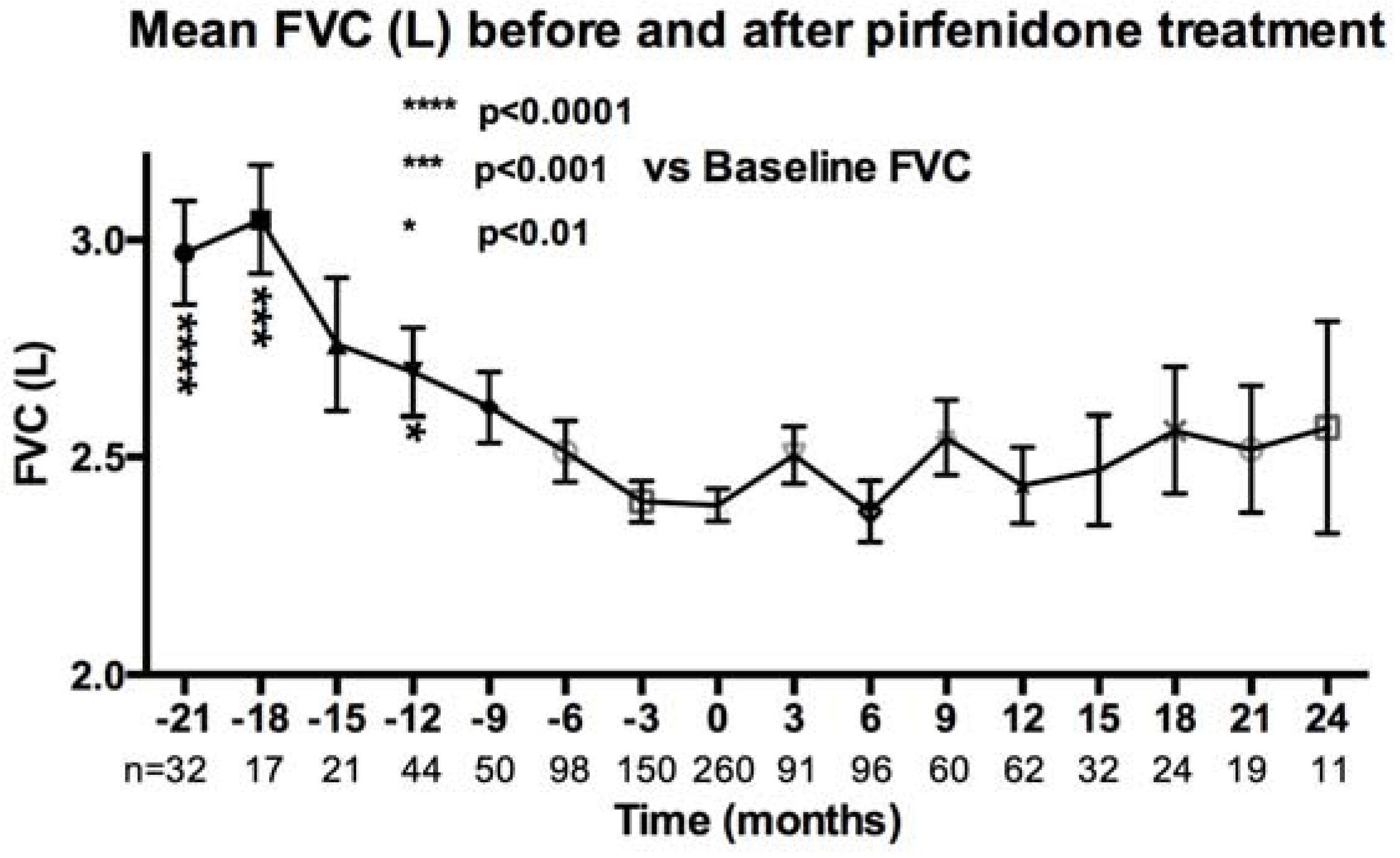 Our results demonstrating a reduction in the decline in FVC after pirfenidone treatment in a real world population over time is important but we accept that our study has some limitations. Our access to lung function results before and after treatment was less than clinical trial patients. Missing data limits the robustness of the analysis, as evidenced by the lower frequency of FVC values at numerous time points. Clinical trials impute missing FVC data when patients die. We have not imputed data for the 20% that have died. Our FVC data is therefore biased towards those patients that survive on treatment and as a result the post pirfenidone FVC values may be biased towards milder patients with higher FVC who are thus more likely to survive. This data highlights how difficult it is to determine efficacy of a therapy within the real world setting.