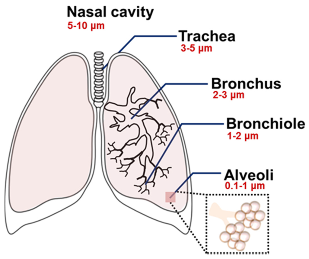 Size-dependent regional deposition of micro- and nanoparticles within the respiratory system after the inhalation. Reproduced from Reference [50] with permission from The Royal Society of Chemistry.