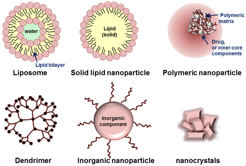 Various organic or inorganic materials, such as lipids, proteins, synthetic/natural polymers, and metals are currently used for the preparation of nanoparticles [62,63]. Based on their building components and characteristic dimensionality/structures, nanoparticles can be classified into several groups. Liposomes, micelles, polymeric nanoparticles, dendrimers, and inorganic nanoparticles including nanocrystals are typical platforms of nanoparticles (Figure 3). Each type of nanoparticle has its own advantages and limitations for targeted delivery of therapeutics.