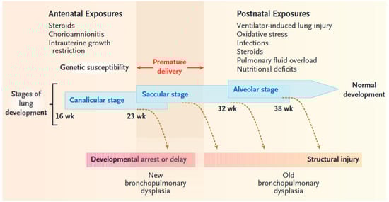 Stages of Lung Development, Potentially Damaging Factors, and Types of Lung Injury. In premature newborns, the lungs are often exposed to several sources of injury, both before and after birth. These exposures, along with genetic susceptibility to problematic lung development, can cause direct airway and parenchymal damage and induce a deviation from the normal developmental path. Depending on the timing and extent of the exposures, lung injury may range from early developmental arrest (new bronchopulmonary dysplasia) to structural damage of a relatively immature lung (old bronchopulmonary dysplasia). Premature infants born at a gestational age of 23 to 30 weeks (shaded region)—during the canalicular and saccular stages of lung development—are at the greatest risk for bronchopulmonary dysplasia. From Eugenio Baraldi, M.D.; Marco Filippone, M.D. Chronic Lung Disease after Premature Birth. N. Engl. J. Med. 2007, 357, 1946–1955. Copyright © 2007 Massachusetts Medical Society. Reprinted with permission from Massachusetts Medical Society.