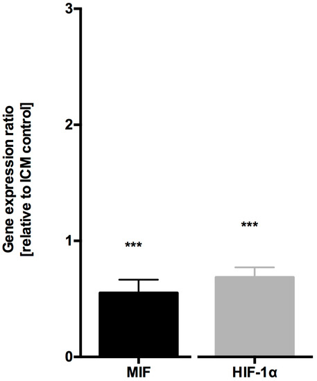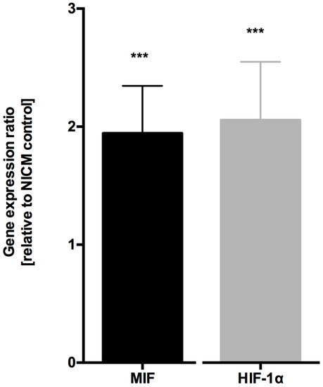 MIF mRNA expression in myocardial samples from patients with ICM was doubled compared to samples from patients with NICM (1.944 ± 0.63, p < 0.001, n = 10, Figure 1). Since HIF-1α is the key player in acute and chronic hypoxic signaling pathways and is one of the transcription factors to regulate MIF expression [24,29], we next analyzed HIF-1α expression. In myocardial samples from ICM patients, HIF-1α expression was increased compared to myocardial samples from NICM patients (2.056 ± 0.79, p < 0.001, n = 10, Figure 1).