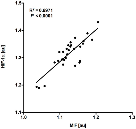MIF and HIF-1α expression levels in myocardial samples showed a close correlation (R2 = 0.6971, p < 0.0001, n = 30, Figure 3) hinting at an association with hypoxia-induced HIF-1α expression with consecutive MIF gene regulation in cardiomyopathy.