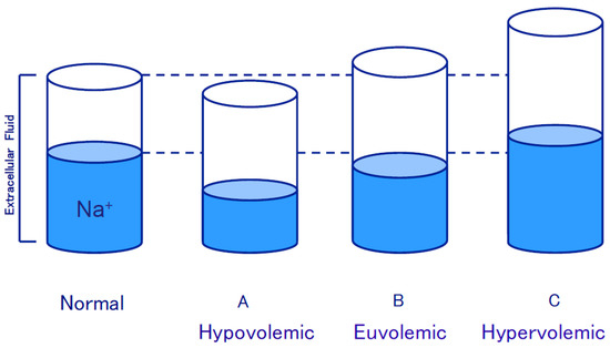 Three types of hyponatremia. (A) Hypovolemic hyponatremia; (B) Euvolemic hyponatremia; (C) Hypervolemic hyponatremia.