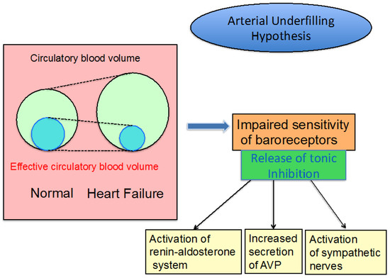 Renal Na and water excretion are predominantly regulated by the integrity of arterial circulation, that is they are determined by cardiac output and peripheral vascular resistance. Several baroreceptors on the high pressure side of the circulation can sense arterial underfilling. They are located in the carotid sinus, left atrium, aortic arch and renal afferent arterioles. Reduction of baroreceptor sensitivity could relieve the “tonic inhibition” on the afferent vagal nerve pathway of hormonal synthesis and secretion by the hypothalamo-neurohypophyseal system [7,8,9,10,11]. Such a reduction occurs when there is a reduction in systemic arterial pressure, cardiac stroke volume, renal perfusion or peripheral vascular resistance. In congestive heart failure, cardiac output is decreased following reduced stroke volume, though there is an increase in total circulatory blood volume. Low cardiac output could promote a decrease in “effective circulatory blood volume”, and impairs the sensitivity of baroreceptors. A reduction in effective circulatory blood volume is closely related to increases in the activity of the sympathetic nervous system, activation of the renin-angiotensin-aldosterone system and non-osmotic release of AVP. However, it remains unclear how baroreceptors sense the decrease in effective circulatory blood volume linked to low cardiac output in heart failure.