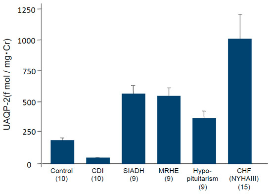 Urinary excretion of AQP2 (UAQP2) was detected in both soluble and membrane-bound forms by Western blot analysis [25]. Immunoblots of urine samples showed AQP2 with molecular sizes of 29 kDa and 40–50 kDa. The band at 40–50 kDa represents a glycosylated form of the 29 kDa protein. UAQP2 can be determined quantitatively by radioimmunoassays or ELISAs [26,27]. The fraction of AQP2 excreted into the urine is approximately 3% of the AQP2 present in renal collecting duct cells [28]. We found positive correlation of UAQP2 with plasma AVP levels in normal subjects [26]. As shown in Figure 3, UAQP2 was markedly elevated in patients with SIADH, hypopituitarism, mineralocorticoid-responsive hyponatremia of the elderly (MRHE) and congestive heart failure [29,30]. In these disorders, plasma AVP levels were persistently increased. In contrast, UAQP2 was depressed in central diabetes insipidus, where AVP secretion is absent. Furthermore, we demonstrated that there was also a positive correlation between UAQP2 and plasma AVP levels in congestive heart failure [30]. Taken together, these findings suggest that elevation of UAQP2 is derived from the exaggerated hydroosmotic action of AVP in a pathological state of impaired water excretion. Measurement of UAQP2 is a useful tool for evaluating water metabolism disorders.