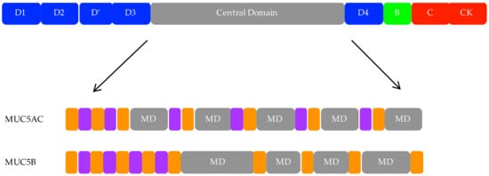 Multidomain structure of the mucins 5AC and 5B (MUC5AC and MUC5B). Top: generic representation of a polymeric mucin. Secreted polymeric mucins possess cysteine-rich vWf-like amino (D1, D2, D’, and D3) and carboxy (D4, B, C, and CK) terminal domains, important for dimerization and polymerization of polymeric mucins, as well as a large, central domain. Bottom: Central domain organization of MUC5AC and MUC5B. The hallmark of the MUC family members are the mucin domains (MDs). These domains are unique in sequence and size, and vary in length and number between different mucins including MUC5AC and MUC5B. They are rich in serine, threonine, and proline, and are the site of O-glycosylation. Additionally, the central region contains repetitive (grey), non-repetitive (purple), and cysteine-rich (orange) domains.
