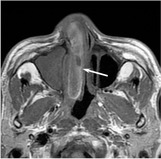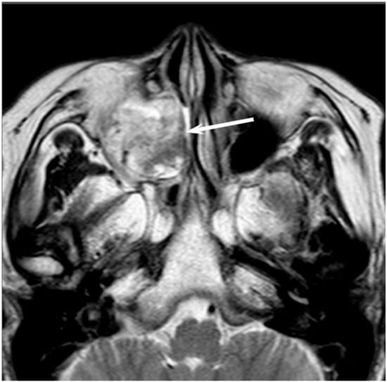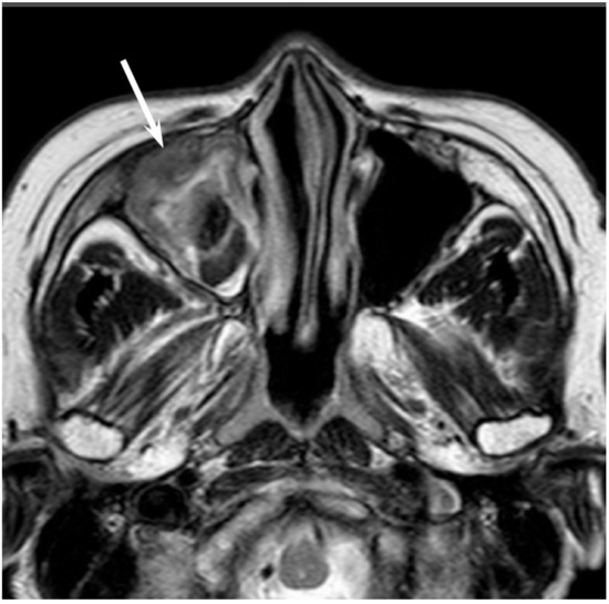 Non-intestinal type adenocarcinomas of the right maxillary sinus. T2-weighted image showing a heterogeneously hyperintense lesion (arrow).