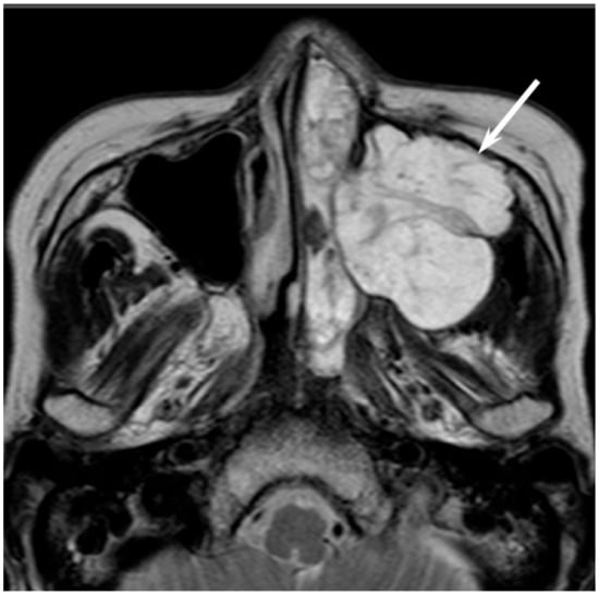 Adenoid cystic carcinoma of the left maxillary sinus and nasal cavity. T2-weighted image showing a well-demarcated, lobulated, heterogeneously and strongly hyperintense lesion (arrow).