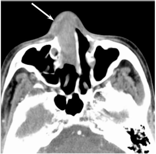 The average diameter of head and neck RMSs (HNRMS) is 4.5 cm. Most of the HNRMSs have ill-defined margins with adjacent bony destruction and extension into the surrounding spaces [39,40]. On CT, HNRMSs appear as an isodense or slightly hypodense mass and show homogeneous enhancement on contrast-enhanced CT (Figure 9). Intratumoral calcification and hemorrhage rarely occur in HNRMS. On MRI, HNRMSs show isointensity relative to muscle on T1WI, and moderate hyperintensity relative to muscle on T2WI [39,40]. On contrast-enhanced T1WI, HNRMSs show various enhancement patterns; however, the majority of HNRMS shows moderate homogenous enhancement.