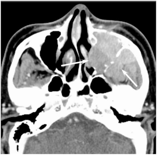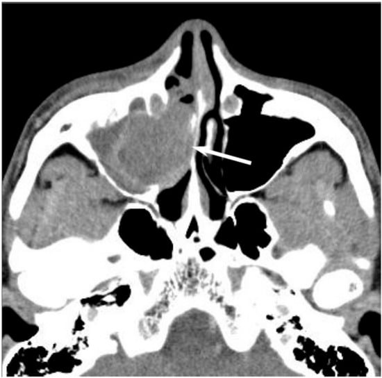 Diffuse large B-cell lymphoma of the left maxillary sinus. Contrast-enhanced CT image showing a homogeneously enhanced lesion accompanied by remaining sinus walls as a linear structure within the tumor (arrows).