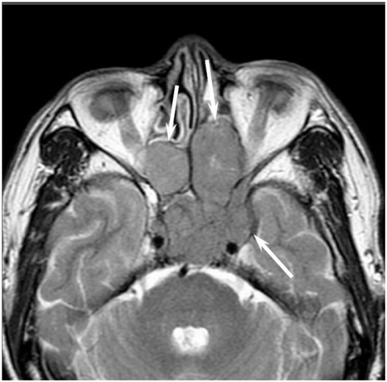 Extramedullary plasmacytoma of the bilateral nasal cavity. T2-weighted image showing a homogeneously isointense lesion (arrows).
