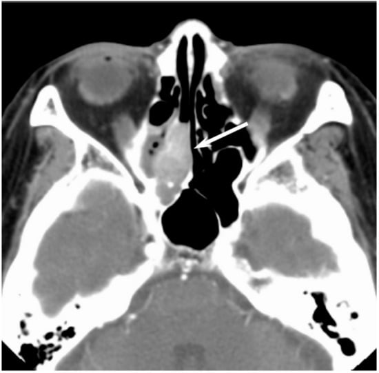 Sinonasal undifferentiated carcinoma of the right nasal cavity. Contrast-enhanced CT image showing an ill-demarcated, heterogeneously enhanced lesion (arrow).