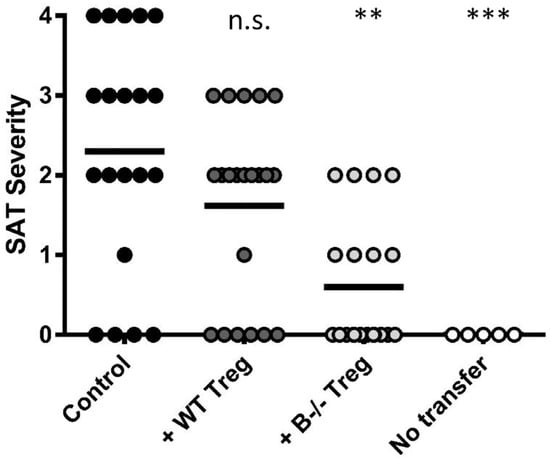 T regulatory cells (Treg) from B−/− mice are more effective at suppressing spontaneous autoimmune thyroiditis (SAT) than Treg from wild-type (WT) mice. T cells from CD28−/−B−/− Non-obese diabetic (NOD).H-2h4 mice were cultured with or without Treg from WT or B−/− NOD.H-2h4 mice. TCR−/− NOD.H-2h4 recipients were given 5 × 106 cultured T cells, and were given NaI in their drinking water. The no transfer group did not receive T cells. Thyroids were removed 8 weeks later. ** p < 0.01; *** p < 0.001, n.s., not significant. Results are the mean SAT severity scores from individual recipient mice. See [] for additional details.