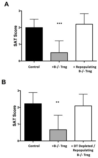 Our results indicating that Treg depletion results in autoimmune disease in B−/− mice that are normally resistant to those diseases [,,] suggests that Treg in B−/− mice could have superior suppressor function compared to Treg in B cell-positive mice. It is also possible that activated Teff in B cell-positive mice are relatively resistant to suppression by Treg or that Treg become unstable in an inflammatory environment []. To determine if Treg in WT and B−/− NOD.H-2h4 mice differ in their ability to suppress activation of Teff that induce SAT in NOD.H-2h4 mice, we used a protocol in which Treg from WT and B−/− mice interacted in vitro with a single population of Teff and non-B APCs before transfer to mice that had B cells but no T cells []. The results indicated that Treg from B−/− mice were more effective than the same number of Treg from WT mice in suppressing activation of Teff for SAT (Figure 1). Both Treg populations proliferated and survived to a comparable extent in the recipient mice indicating that Treg populations differ functionally in WT and B−/− mice []. Our results are consistent with those reported by another group in a mouse model of experimental arthritis [,], but functional differences between Treg in WT and B−/− mice were not observed in models of EAE [] or diabetes [].