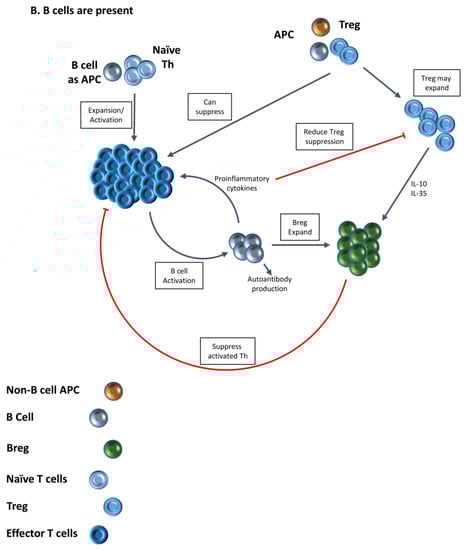 Interactions between Treg, B cells and effector T cells (Teff) in development of autoimmune diseases. (A) When B cells are absent or reduced in number (e.g., after anti-CD20 treatment), B cells are not available to present autoantigen. Presentation of autoantigen by other antigen-presenting cells (APC) results in little expansion or activation of naïve T helper (Th) cells and they do become Teff. However, Treg may expand and they are activated, and autoimmune disease does not develop because Treg activity is dominant. When Treg are depleted, presentation of autoantigen by non B cells leads to activation and expansion of naïve Th, they become Teff and autoimmunity develops; (B) B cells are present and able to function as APC. Naïve Th expand and become activated. Presentation of antigen to Treg may also lead to their activation, but Th activation is dominant. Suppression by Treg is insufficient to prevent autoimmune disease. Over time, Treg can produce Interleukin (IL)-10 and IL-35 leading to expansion of B regulatory cells (Breg) which suppress activated Th and effector B cells. Expanded Th produce proinflammatory cytokines and interact with B cells to promote their activation and production of autoantibody. Proinflammatory cytokines produced by B cells can also interfere with Treg function and/or activation, rendering suppression by Treg less effective. The dominant outcome is autoimmune disease.