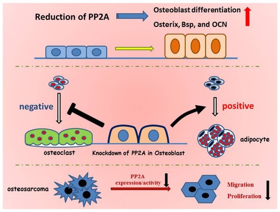 PP2A regulates osteoblast differentiation and function. PP2A is thought to have critical roles in not only osteoblast differentiation but also in the regulation of the differentiation of the surrounding cells such as adipocytes and osteoclasts. A reduction in PP2A accelerates osteoblast differentiation and bone formation through upregulation of the expression of bone-related genes including ALK phosphatase, Osterix, Bsp, and OCN. Downregulation of PP2A in osteoblasts negatively controls osteoclast differentiation by reducing the ratio of sRankL/OPG; in contrast, it positively regulates adipocyte differentiation by increasing the expression of adipocyte-related genes such as PPARγ and C/EBPα. Furthermore, greater expression of PP2A is observed in osteosarcoma cells and a reduction in PP2A suppresses the proliferation, migration, and metastasis of osteosarcoma cells.