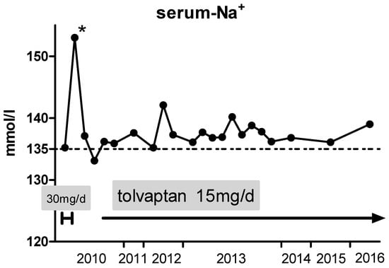 Figure 2) for more than six years now. A further episode of life-threatening hyponatremia did not occur since the initiation of oral therapy with tolvaptan.