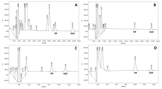 Normal Coenzime Q10 (CoQ) chromatograms of different biological specimens. (A) serum; (B) urine; (C) muscle; (D) cultured skin fibroblasts. In each specimen, type Q9 and Q10 have a different retention time that is related to differences in sample matrices and the high-pressure liquid chromatography (HPLC) column length required for separation.